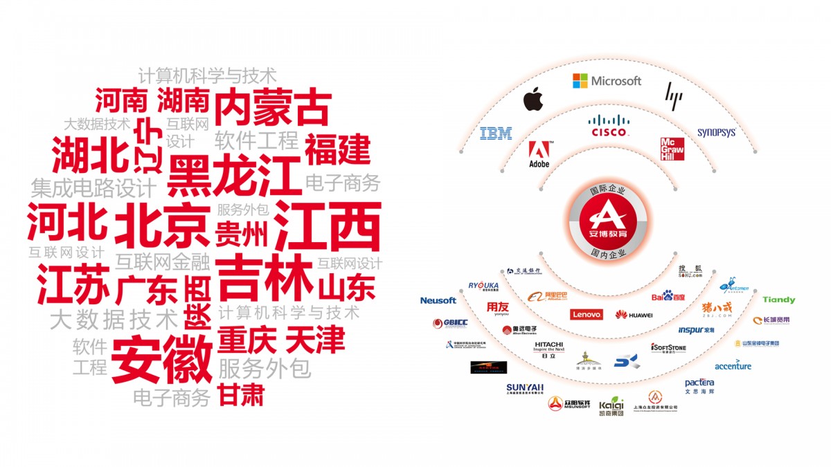 2006年,安博IT实训体系通过教育部科技成果鉴定,并以此体系为基础安博与教育部开展“IT实训推广工程”。安博首创大规模园区型实训基地布局在环渤海、长三角地区等经济带,融入区域经济发展。2015年, “安博应用技术型人才培养体系与创新模式”通过教育部科技成果鉴定。今天,安博面向人工智能、智能制造、大数据、云计算、集成电路等领域推出系列课程体系,通过自主技术创新推出3D全息教室、智能校园等系列智慧教育物联解决方案,携手合作机构开启新的未来。机构”等荣誉。